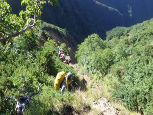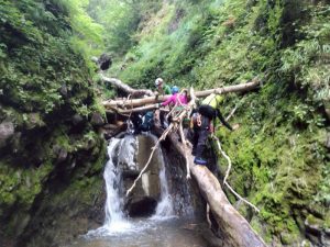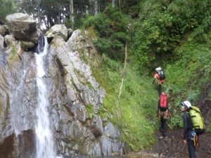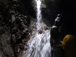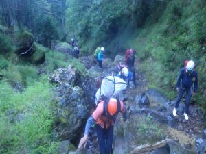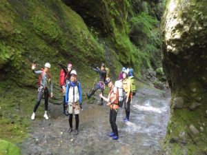 総勢10人です。出会いは水がなく、通りすぎてしまいました。中間あたりまでは楽ちんでいい感じですが、穴をくぐる滝より厳しくなり、次のもろシャワークライムの滝はショルダーで超え、2番手が水流のガバが取れて苦労して、そのあとは、ロープで引っ張り上げました。