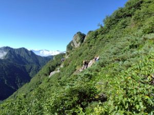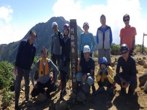 次の滝は、右手のスラブ滝を登り、懸垂後に、木登り滝を超えるとようやくゴルジュが終わりました。テンバは素晴らしく焚火で盛り上がりました。翌日、沢より左側の尾根にルートを取り、最後は、尾根より一般道へトラバースして合流しました。阿弥陀岳で集合写真を撮り御小屋尾根より戻りました。お疲れさまでした。