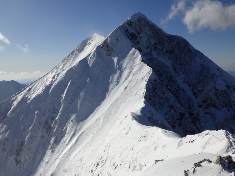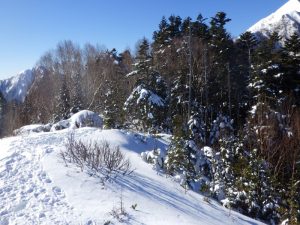 明るくなる6:45分ごろに出発、2200m過ぎより雪が出てアイゼンを履くことに